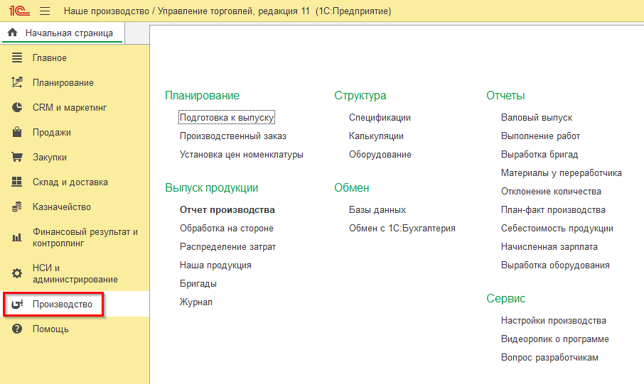 Продукт «Наше производство» поставляется как расширение к программе 1С:Управление торговлей После установки у вас появляется новая подсистема «Производство» расположенная среди других подсистем программы. Установка расширения «Наше производство» сохраняет возможность обновления «1С:Управление торговлей» типовыми обновлениями от фирмы 1С.