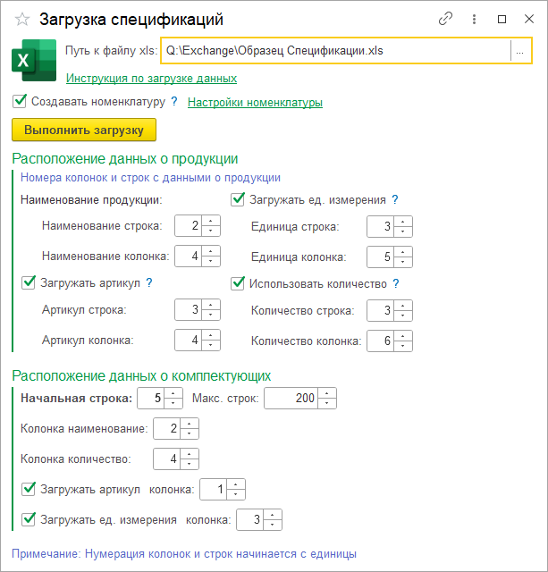 В MS Excel файле должна находится информация об изделии, в том числе наименование, артикул, а также количество изделий на одну спецификацию и название единицы измерения. В форме загрузки данных, в разделе «Расположение данных о продукции» укажите, в каких ячейках (номер строки и колонки) находятся данные. Если каких-либо данных о продукции нет (кроме наименования), то можно отключить из загрузку, сняв соответствующие флажки.