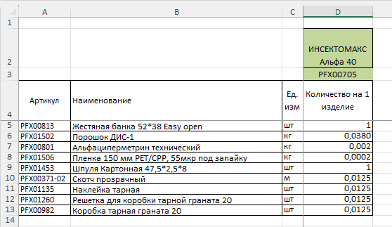 На рисунке ниже показан пример xls-файла со спецификацией. Данные о наименовании продукции находятся в строке №2, в колонке №4. Данные об артикуле продукции находятся в строке №3, в колонке №4.