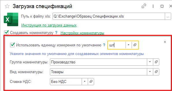 Для корректного создания новых элементов справочника «Номенклатура» необходимо наличие информации об единице измерения. Если в файле MS Excel такой информации нет, то используется значение по умолчанию, заданное в настройках.