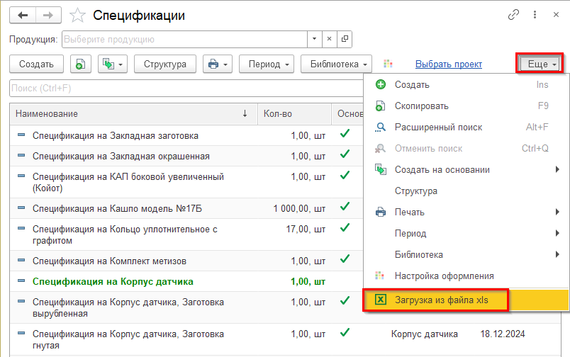 В подсистеме «Производство» реализован функционал загрузки данных из файлов программы MS Excel в производственную спецификацию. Для загрузки спецификаций из файла MS Excel откройте пункт «Загрузка из файла xls», расположенный в верхней командной панели справочника «Спецификации» в меню «Еще».